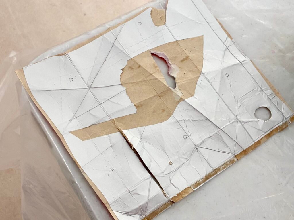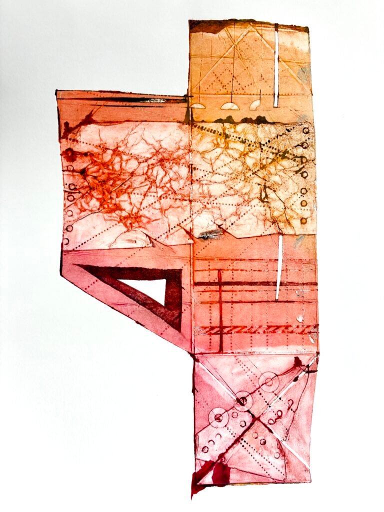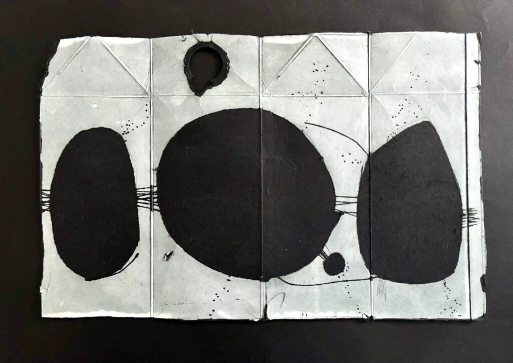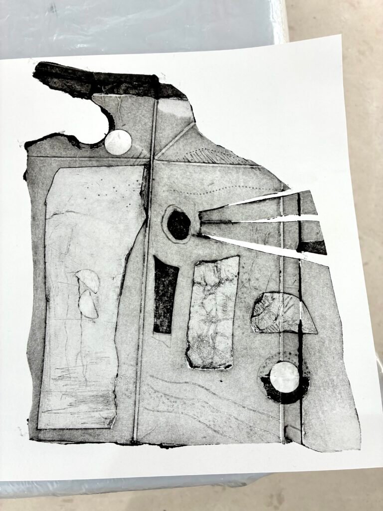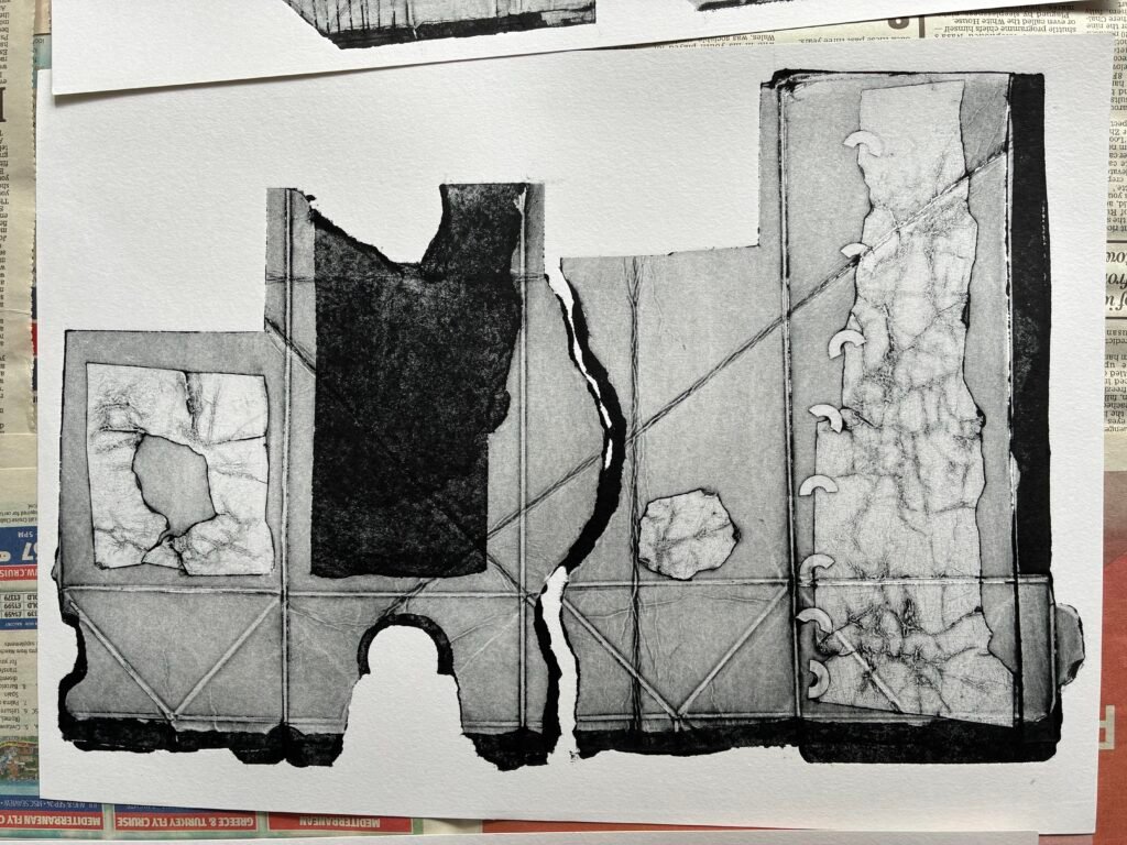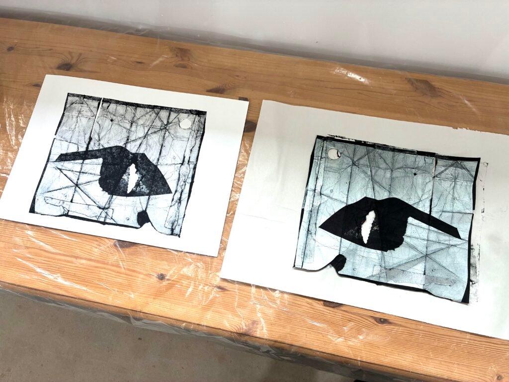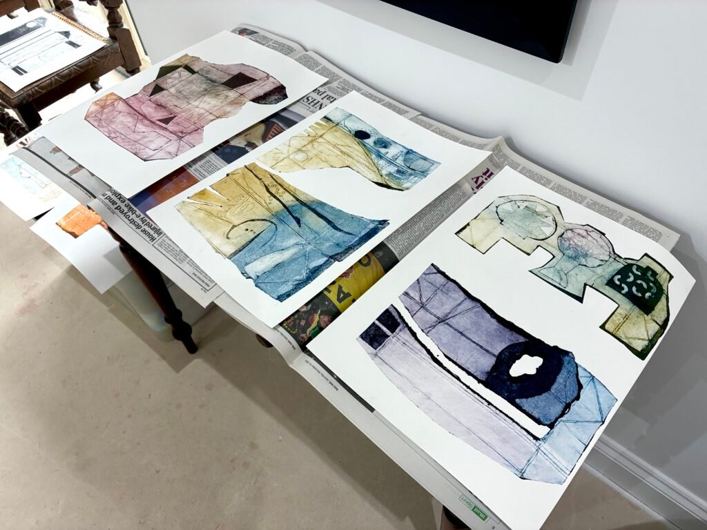 Instead of the usual flat board, this workshop used Tetrapaks – milk or juice cartons to you and me – which I had partly prepared by cutting open and flattening them out, as printing plates. The big difference here is that, unlike those more traditional substrates, Tetrapaks retain all those lovely crease and fold lines, which hold ink and print well. This is interesting, because, alongside any other of the countless other marks which can be added to the soft, receptive surface, they provide the printmaker with a built-in structure – one that can be used as a basis for either abstract or figurative imagery.