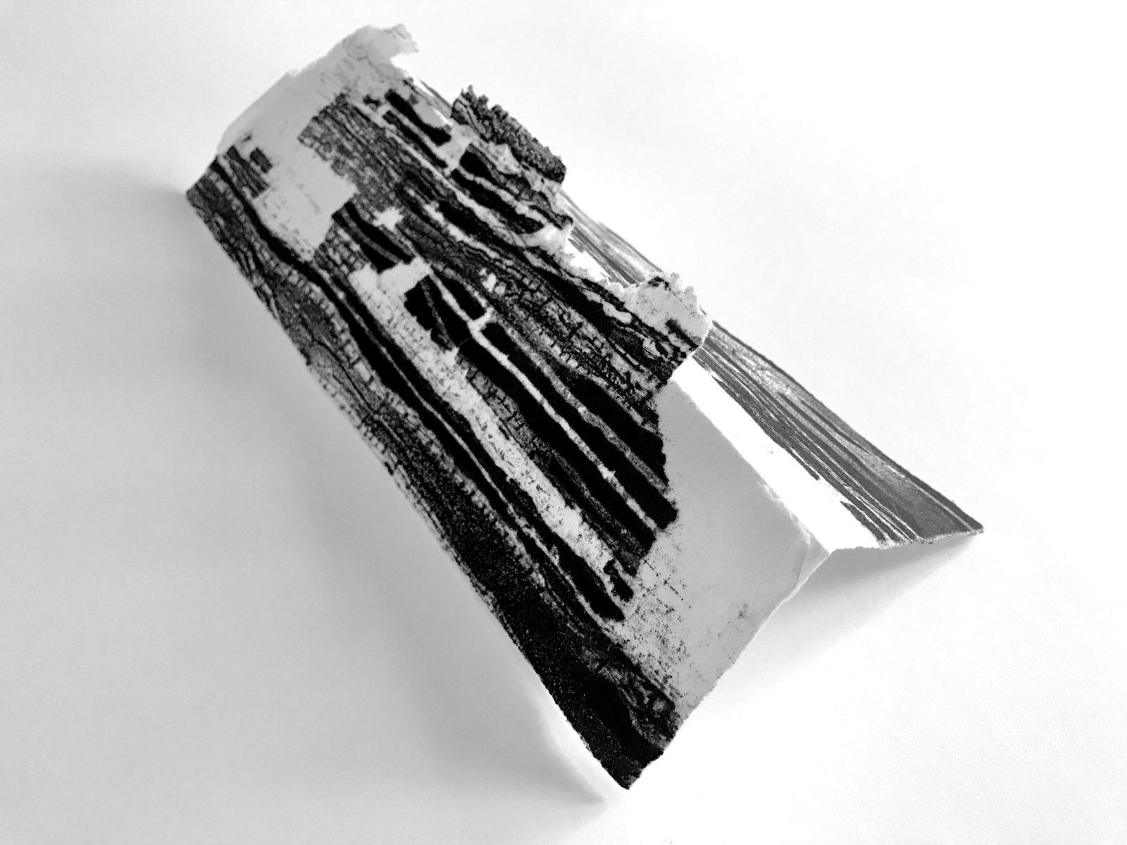 Elements are pieces of failed prints. In most cases the paper stuck to the printing plate and had to be peeled away. However, the piece is left behind were often very interesting, so I began making collages and standalone pieces from these fragments. These pieces often reminded me of precious historical artefacts that were held in place using pins, and so I used thin dressmaking pins, or sometimes sewing, to position my pieces of paper.