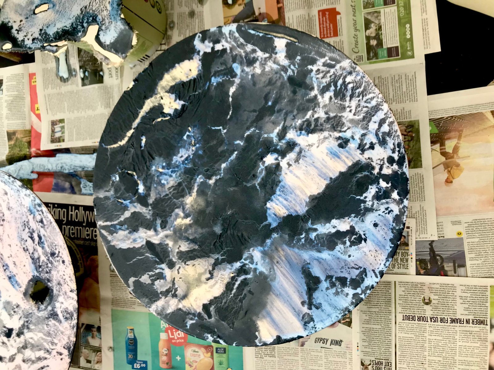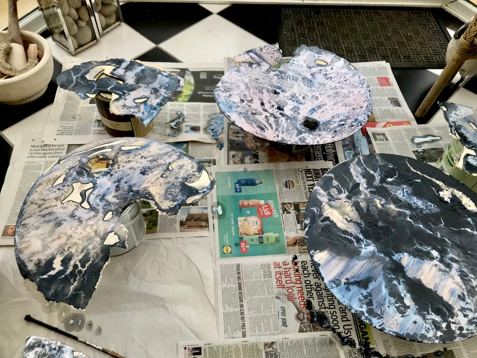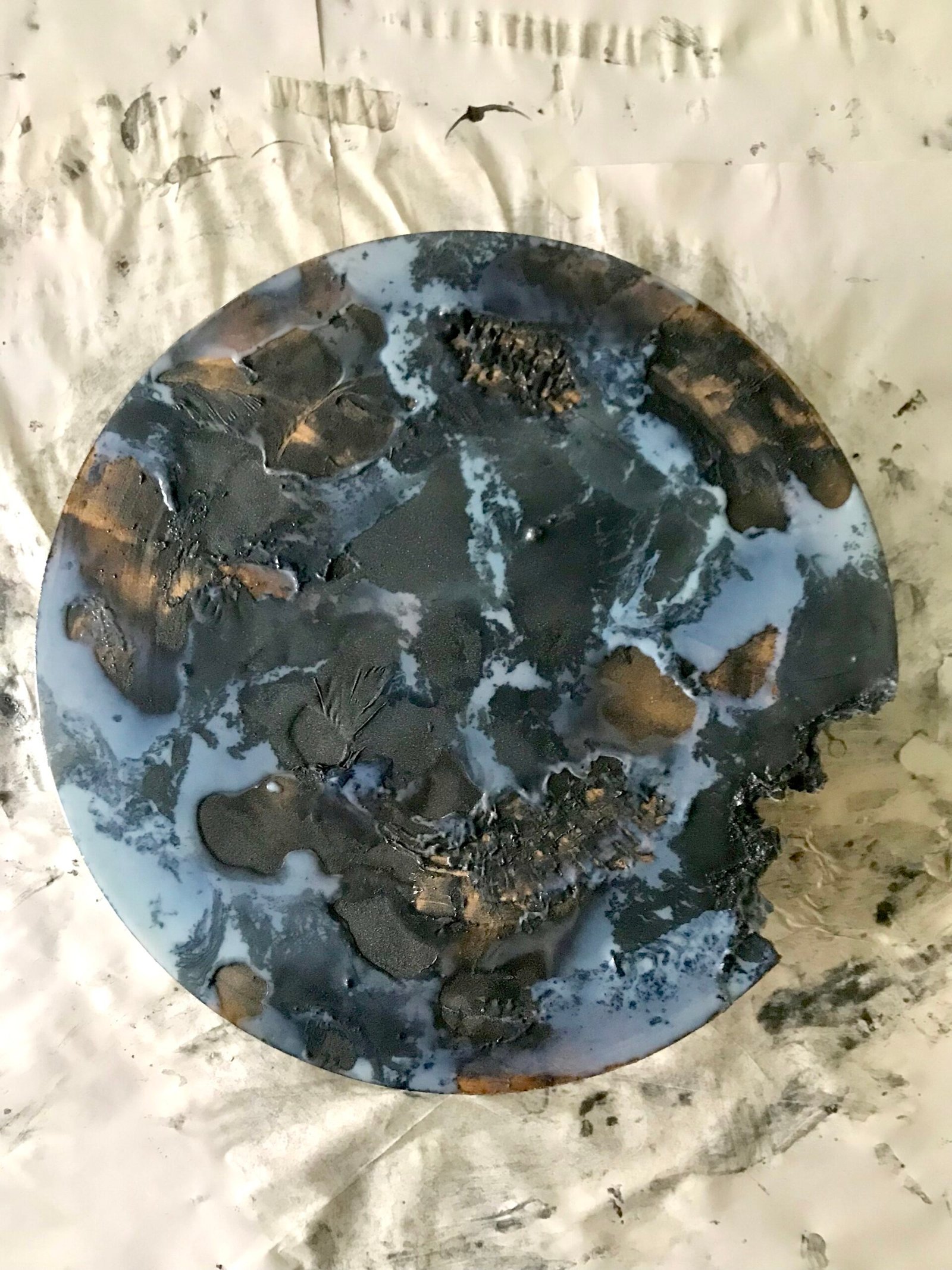 Sometime around 2017, I had discovered that interesting textures could be made by pouring varnish straight from the can onto a birch plywood plate and sprinkling the liquid with carborundum powder. I had tried to cheat or speed up the drying process by using a hairdryer. The real surprise was how the mixture reacted to heat. The surface blistered and peeled away forming dark pools out of the carborundum powder that looked and reacted like lava. These printed beautifully with dark earthy tones and a high degree of contrast. The interesting thing about the plates is that the medium cannot be entirely controlled, so that each plate and resulting print can never be replicated.