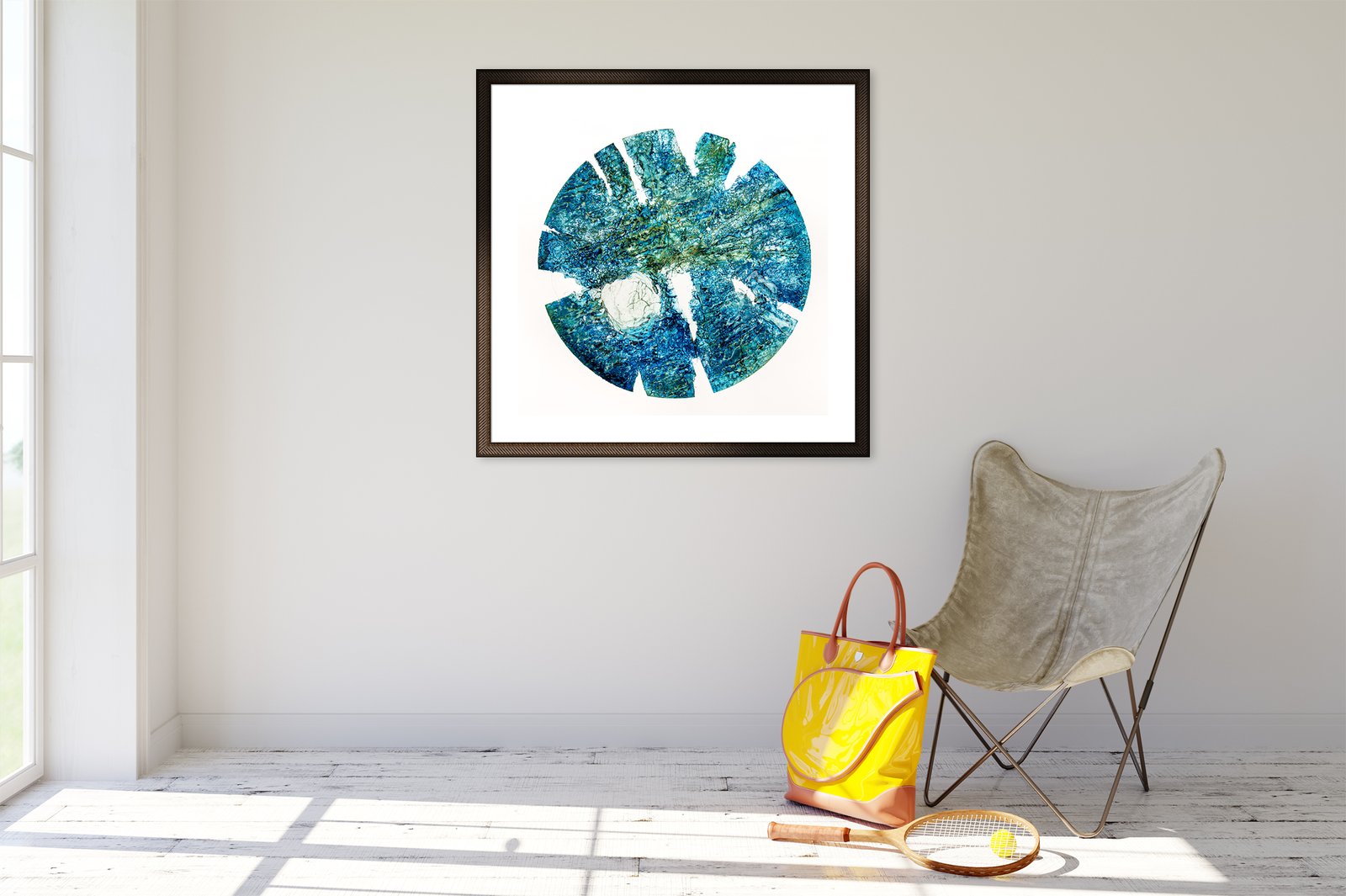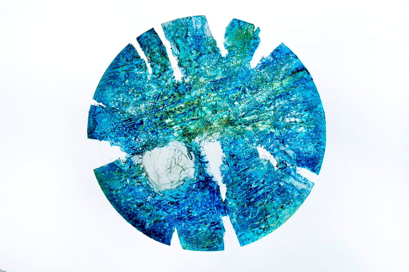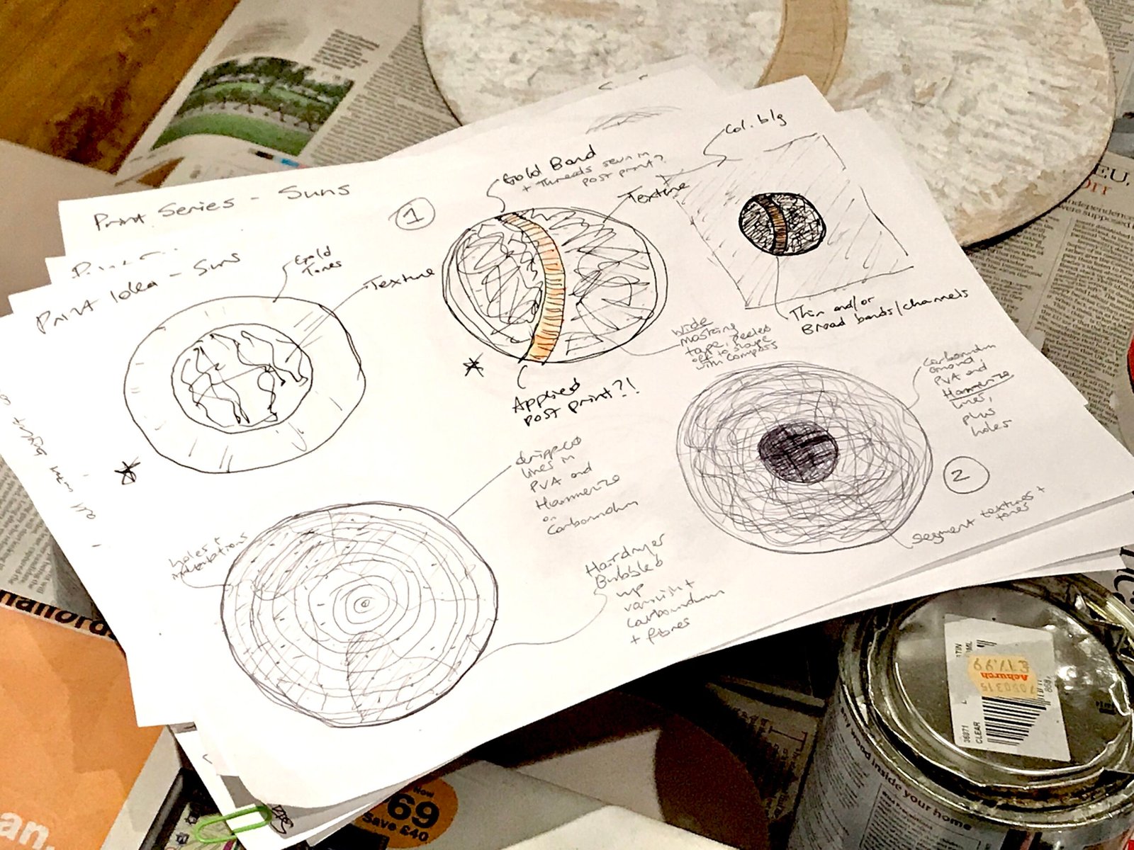 Suns and moons have been a bit of an obsession for me over many years. I suppose it’s the completeness of the circle or fear which is an interesting and attractive shape for many people. Here though, I wanted to do something different with the basic shape, so I cut circles out of Birch plywood using a laser cutter, before setting to work with a pair of thin nosed pliers, nibbling away at the outer edges of the plywood circle, with the intention of creating a shape that would remind me of a dying sun. After the basic shape was made, I used various acrylic gels and cotton threads to add texture to the surface of the plate. The resulting print had a three dimensional quality, typical of many of my collagraphs.