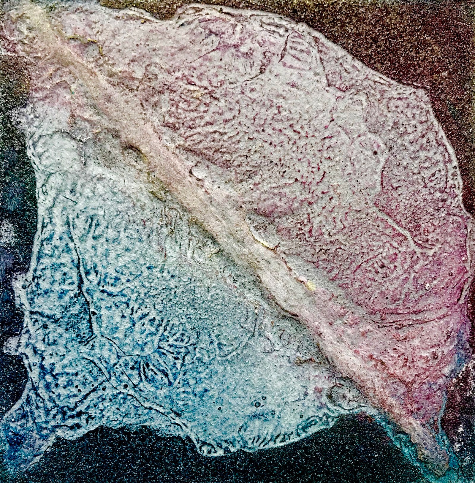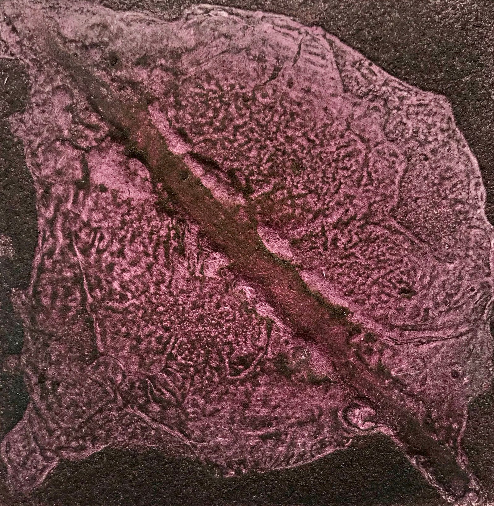 Turn II was one of a batch of around 15 plates that I made at 10cm x 10 cm. The printing plate was made from Birch plywood, and used various acrylic gels smeared around the surface to make interesting shapes and patterns. When the plate was completed but still wet, I thought it needed something dramatic to break up the shapes, so I dragged a screwdriver diagonally through the gels.